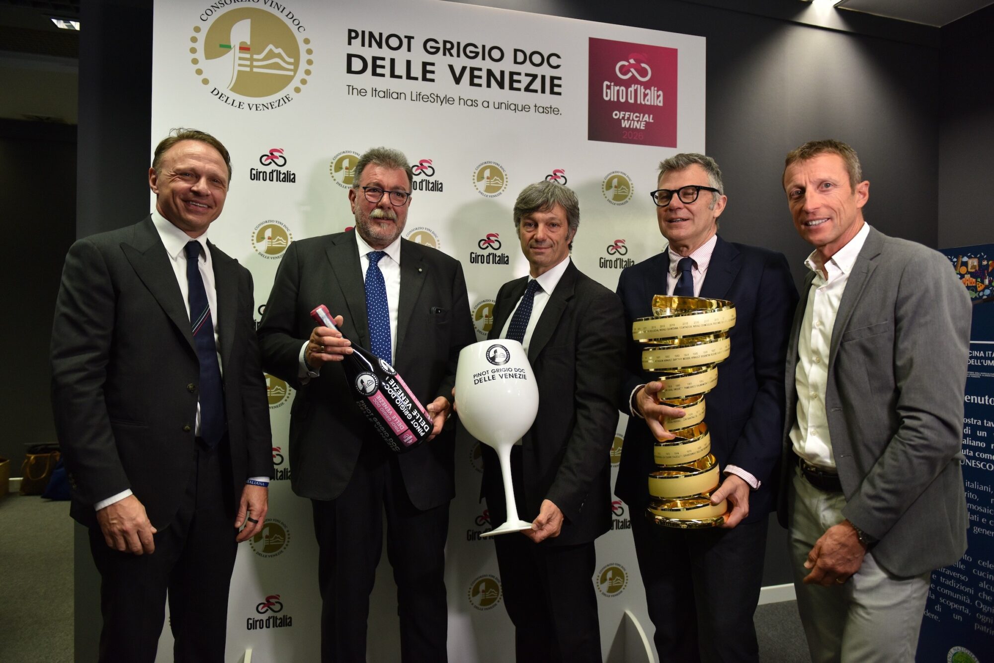 Momento conclusivo dell’evento un brindisi ufficiale con il Pinot Grigio DOC Delle Venezie. Nel contesto è stata inoltre presentata la bottiglia magnum brandizzata DOC Delle Venezie realizzata per il Giro d’Italia, destinata ai momenti di premiazione sul podio, insieme ai trofei del Giro d’Italia, del Giro d’Italia Women e del Giro Next Gen esposti in anteprima.